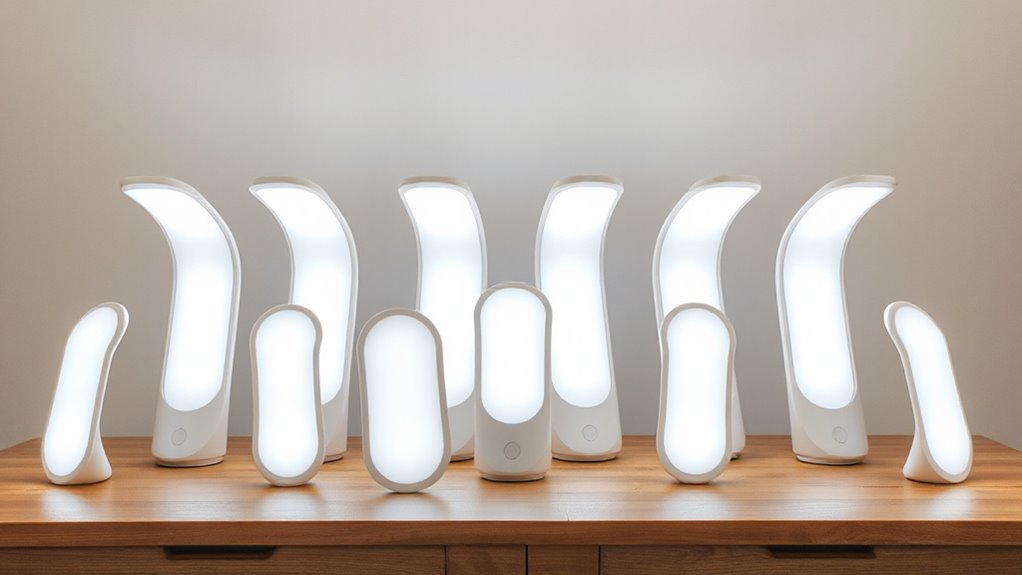 Opting for a light therapy lamp that’s easy to move and place around your space makes daily treatments more convenient. I look for models that are lightweight and compact, so I can carry them effortlessly between rooms or take them on the go. Adjustable mounting options, like wall mounts or detachable stands, add flexibility for different environments. I also consider the size and shape of the lamp to ensure it fits comfortably on my desk or bedside table without cluttering my space. Proper angling and height adjustments are essential to maximize light exposure and effectiveness. In conclusion, I check that the power source and cord length suit my setup, avoiding tripping hazards or the need for extension cords. These factors make daily use simple and tailored to my needs.