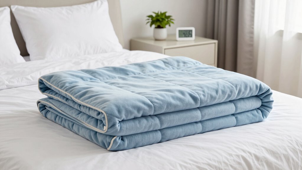 Selecting the right size and fit for a cooling weighted blanket directly impacts your comfort and its effectiveness. An appropriately sized blanket ensures even weight distribution, preventing discomfort or safety issues caused by hanging over bed edges. It should cover your body enough to deliver targeted pressure without excess material that can trap heat or restrict movement. Proper fit also stops the blanket from shifting during sleep, maintaining consistent support throughout the night. Oversized blankets might cause heat retention or limit mobility, while undersized ones may not provide enough coverage or pressure. The best choice matches your bed size and body dimensions, typically covering just the top of your mattress without excessive draping. This balance guarantees comfort, safety, and ideal support for restful sleep.