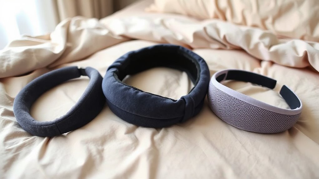 Yes, there are hypoallergenic options for sensitive skin. I’ve researched and found that many brands now offer headbands made from soft, natural, and hypoallergenic fabrics like bamboo, cotton, or silk. These materials reduce irritation and are gentle on sensitive skin. If you have allergies, I recommend checking product labels and reviews to guarantee the headband is specifically designed for sensitive skin, giving you a comfortable and safe sleep experience.