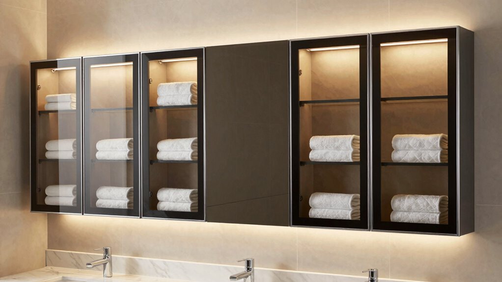 I find that the best-rated towel warmer cabinets are quite energy-efficient, often designed with smart insulation and adjustable settings to minimize power use. They utilize low-wattage elements and sometimes feature timers, helping you save energy when not in use. Overall, these cabinets balance performance with eco-friendliness, making them a great investment for reducing your energy bills while keeping your towels warm and cozy.