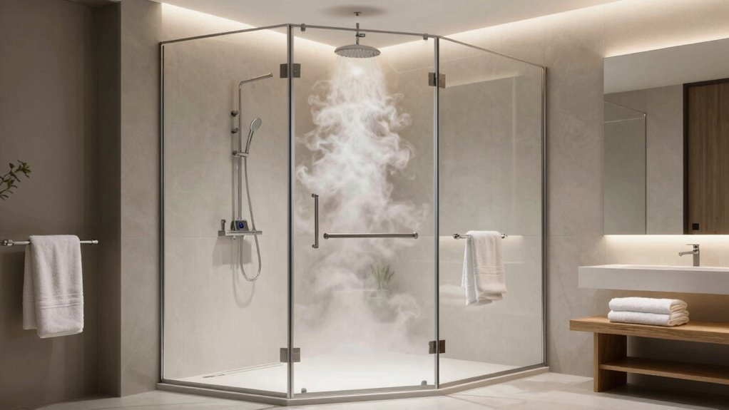 Ever wonder how much energy your steam shower uses? I find that energy efficiency varies widely among models. Some use advanced insulation and smart controls to minimize power, while others can be more wasteful. I recommend looking for units with high energy efficiency ratings or those that feature energy-saving modes. This way, you enjoy relaxing steam sessions without skyrocketing your energy bills, making your home greener and more cost-effective.