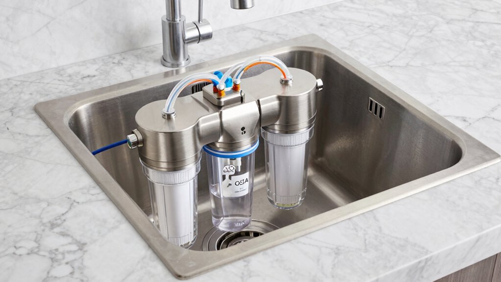 Remineralization technology in under-sink reverse osmosis systems plays a crucial role in restoring essential minerals and balancing water pH. These systems typically add minerals like calcium, magnesium, and potassium to improve taste and alkalinity. Many use multi-stage filters with mineral cartridges or mineral balls that release beneficial ions during purification. Alkaline remineralization filters raise the pH level, producing water with a balanced, spring-like quality—often between 7.5 and 9.0. Some systems feature dual remineralization stages, ensuring consistent mineral content for healthier drinking water. The effectiveness of these technologies is often certified by standards such as NSF/ANSI 58, which guarantees reliable mineral addition and pH adjustment. Choosing the right technology depends on your desired water characteristics and certification assurances.