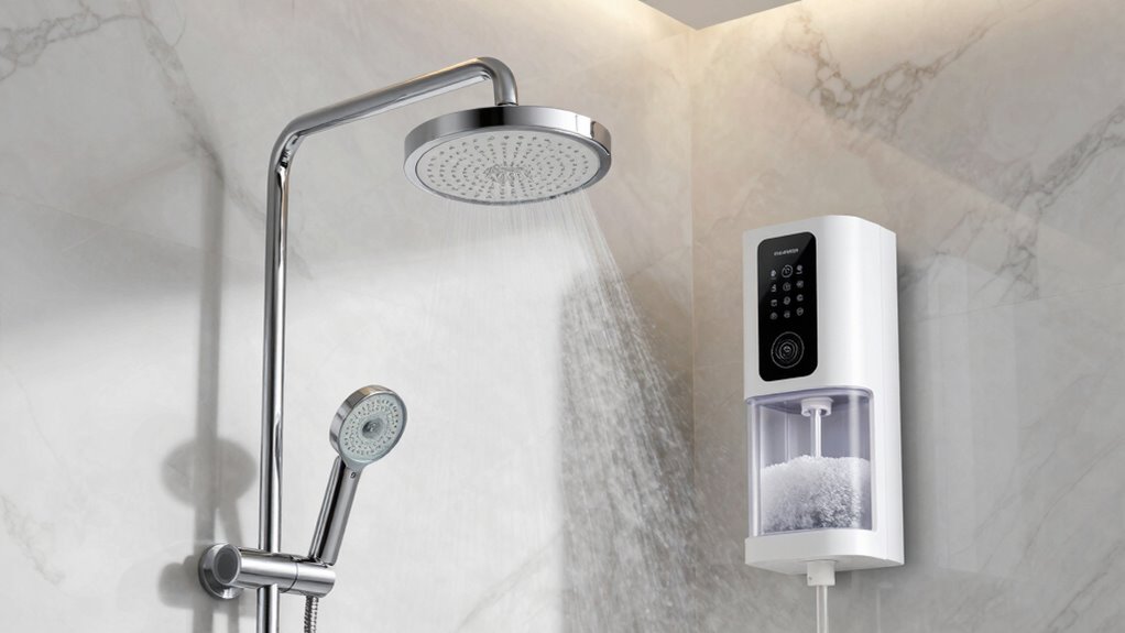 Understanding your water hardness level is essential because it directly influences the size and type of water softener you need for your shower. Water hardness is measured in grains per gallon (GPG) or parts per million (PPM). Soft water ranges from 0-3 GPG, while 4-7 GPG is moderately hard, and over 7 GPG is very hard. Hard water contains high levels of calcium and magnesium, which can cause scale buildup and reduce softener efficiency. For extremely hard water above 10 GPG, specialized systems like ion exchange or salt-based softeners are often necessary. Regular testing helps you accurately determine your water’s hardness, ensuring you select an appropriate system. Knowing your water hardness level helps you choose a softener that effectively protects your shower and plumbing.