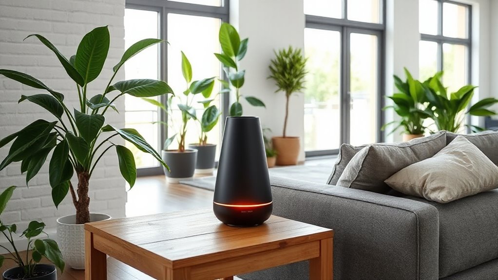 Waterless diffusers are surprisingly energy-efficient, even in large rooms, using just a tiny fraction of electricity. I’ve found their power consumption is often comparable to a small nightlight, making them perfect for continuous use without hiking up your energy bills. They work tirelessly to fill your space with aroma, all while sipping power like a tiny, eco-friendly superhero. You won’t believe how little energy they need!