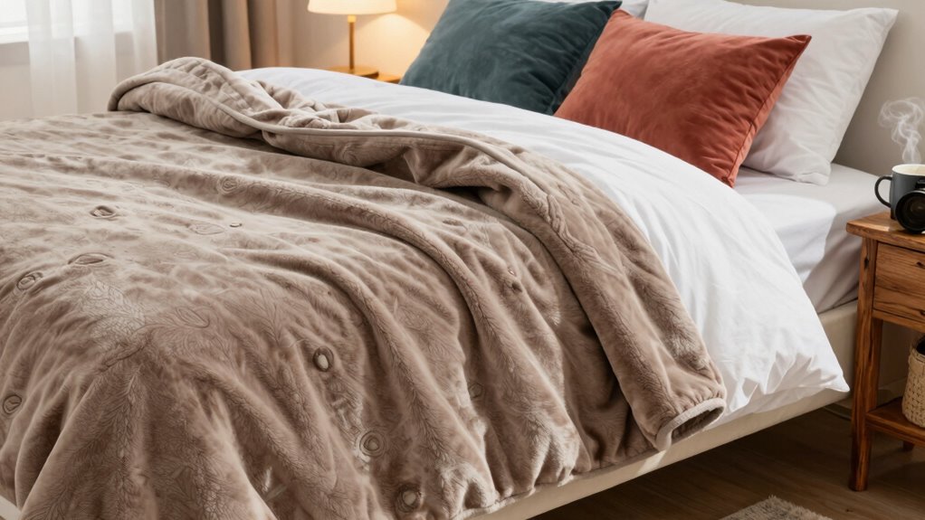 When it comes to staying comfortable throughout the night, breathability and temperature regulation are key factors to contemplate. Choosing a blanket made from breathable materials like cotton, linen, or bamboo can help keep you cool by allowing air to circulate and preventing overheating. Some blankets feature a 7-layer design with small compartments that promote airflow and reduce heat retention. For warmer climates, look for options with cooling features such as glass beads or moisture-wicking fabrics, which enhance comfort by managing moisture and heat. Keep in mind that plush fleece or Sherpa fabrics tend to trap heat more, so they’re better suited for colder environments. Proper ventilation, along with breathable duvet covers, can also considerably improve overall temperature regulation during sleep.